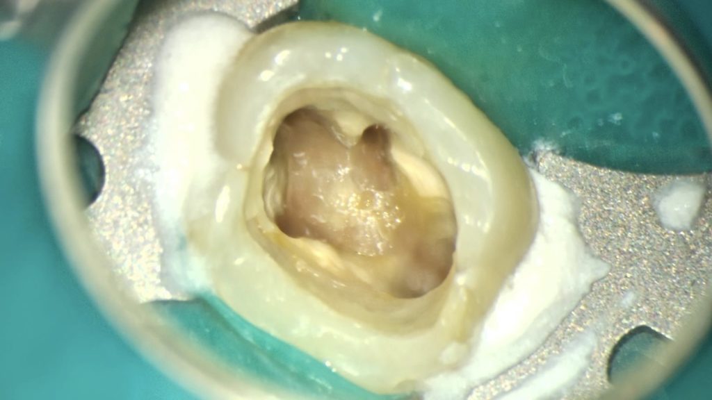→ラバーダム防湿(ゴムのシートで治療する歯のみ隔離)により唾液や細菌の侵入を防止する